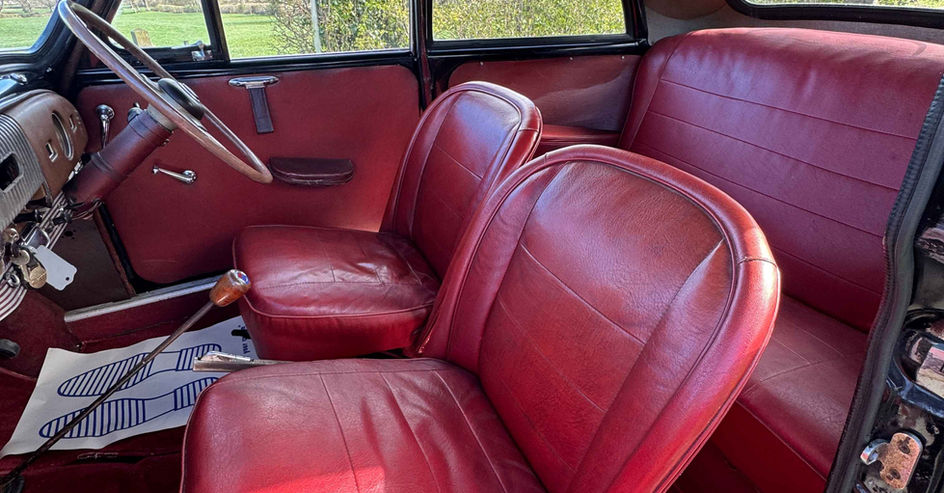 Underneath, the restoration work has been done to a good standard and has had underseal in the past to protect it. The bodywork has a lovely aged patina to it but shines up well, only the front N/S wing has some ‘pitting’ in it where it has reacted. There are a couple of bubbles on the lower part of the O/S door and the odd scratch/mark. The interior is in good order with the original red Rexine seats. The dashboard is quite ‘patina-ed’ but everything’s there, only the clock on the glovebox doesn’t work and the indicator stalk for the trafficators – This has been replaced by a direction switch on the dash for the additional flashing indicators for safety. There is also the original heater in the cabin to help keep things warm in the colder months.